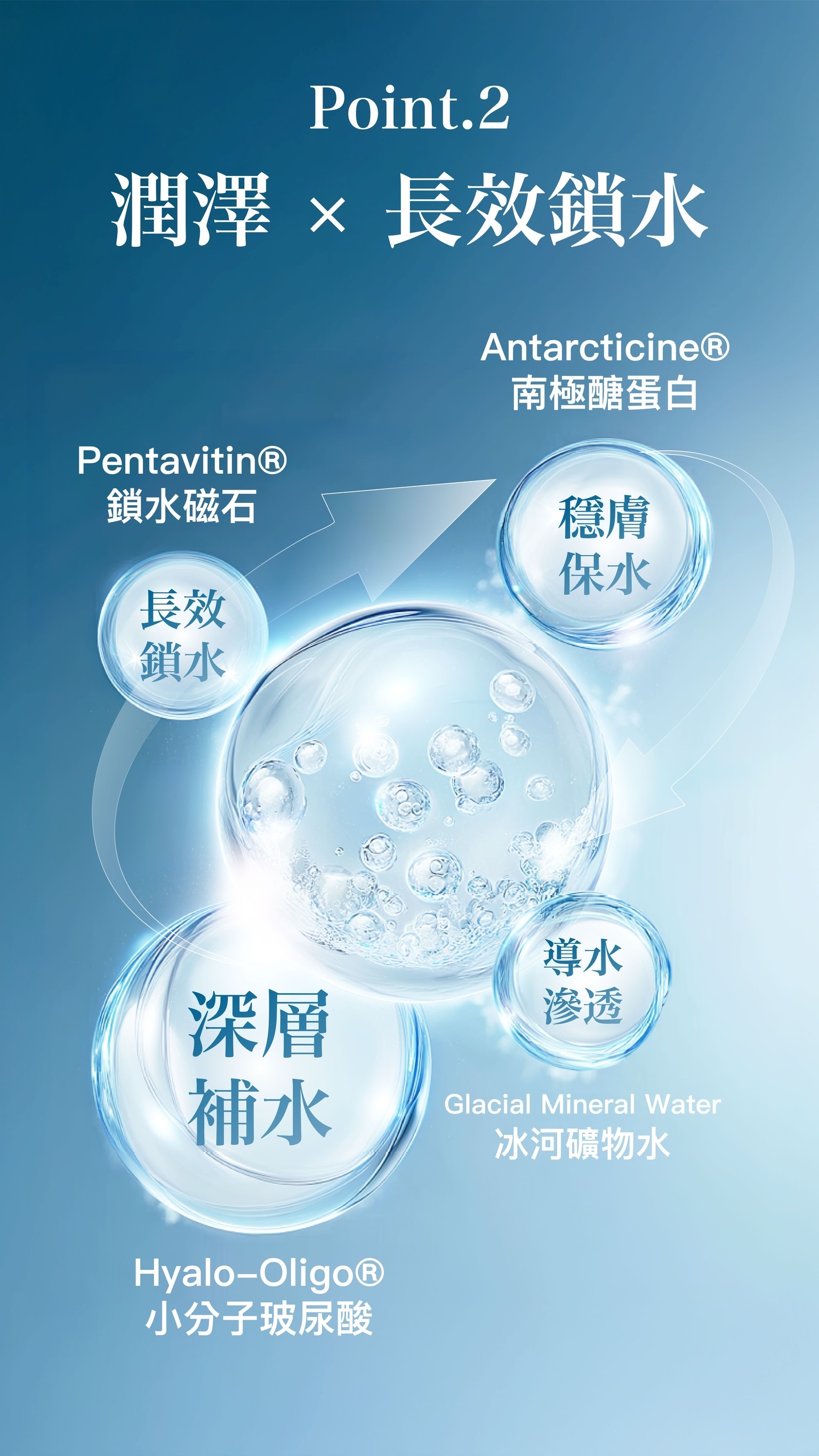 ◼︎潤澤 × 長效鎖水:南極醣蛋白+冰河礦物水+小分子玻尿酸,深層補水強化屏障。
